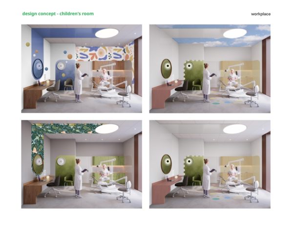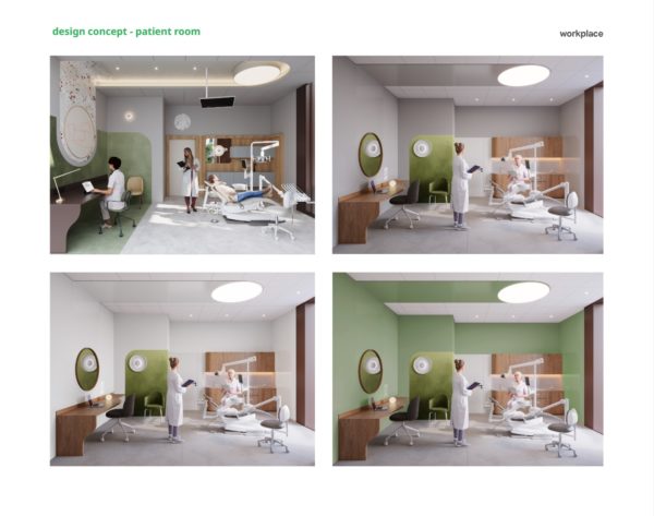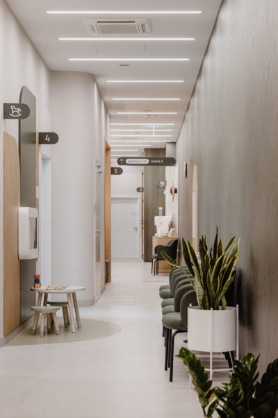 Premium experience: 7 dental treatment rooms, stress-reducing spaces, children’s corners, and regeneration zones.