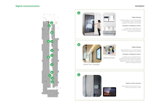 Circulation spaces: featuring seating alcoves, water corners, and digital signage points