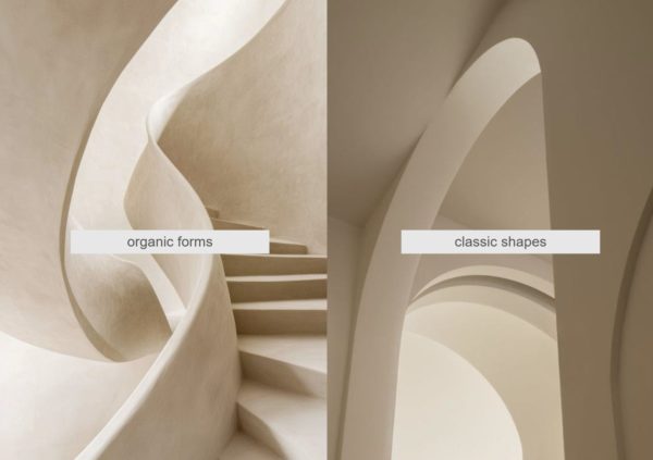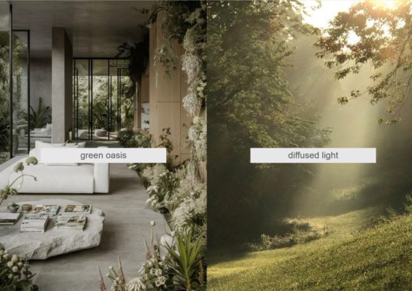 Nature-inspired design: large glazing, greenery as the leading color, rounded furniture forms, natural materials (stone, wood).